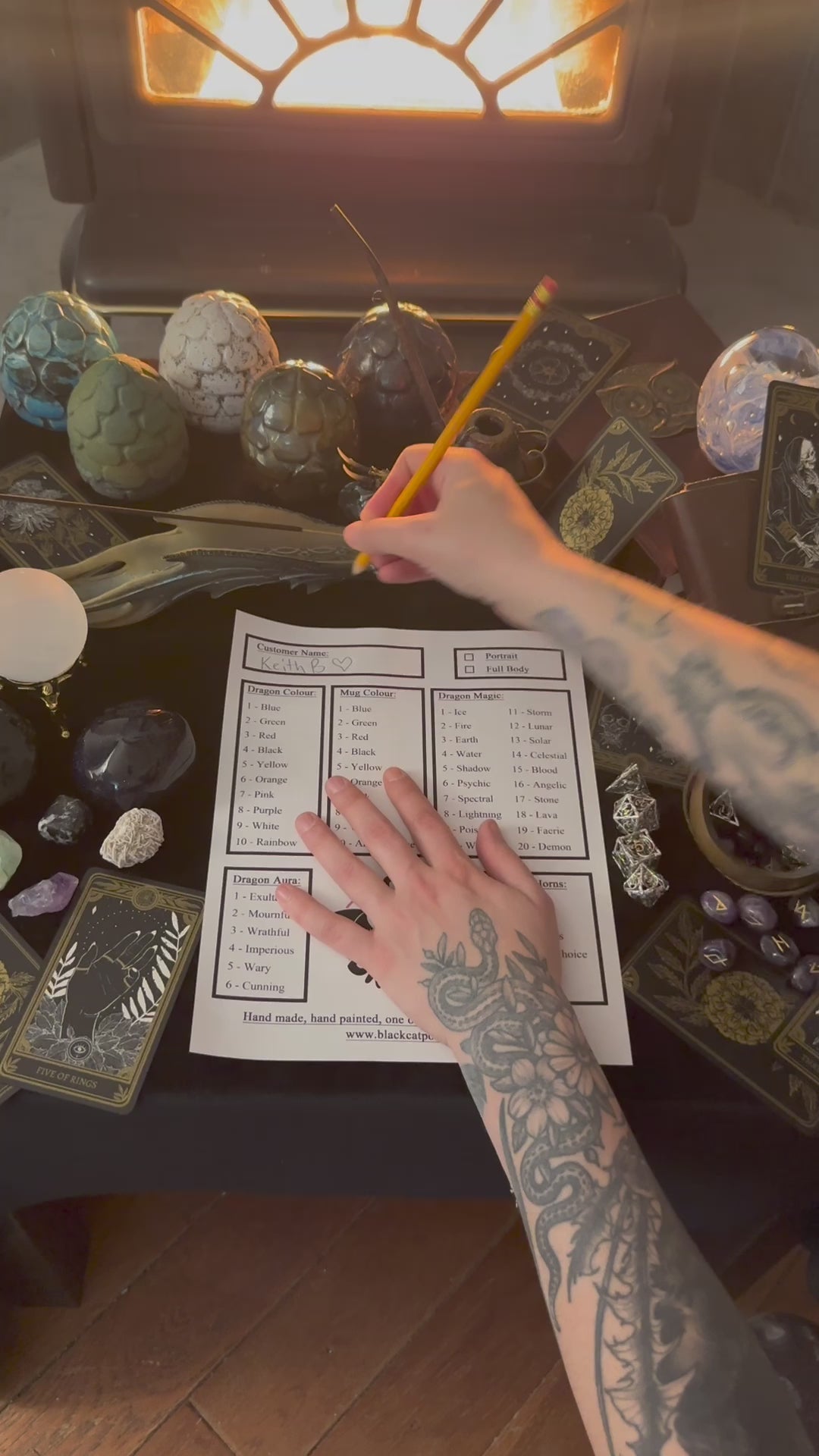 Place an order and let fate decide your dragon companion! Using the attribute sheet pictured, I will roll dice to determine the qualities of your dragon! I will then do a custom illustration of your new friend on a handmade, porcelain mug. The whole process will be video recorded for your viewing enjoyment and posted on social media so you can go back and rewatch it anytime! Turn around time for each mug will be roughly 2 weeks to complete all the steps in the process as well as create your video. Allow 1 week for me to finish your mug and ship it out, then one more week after shipping for your video to be completed and posted! Currently only offering portrait options for dragons. Full body dragons will come later!